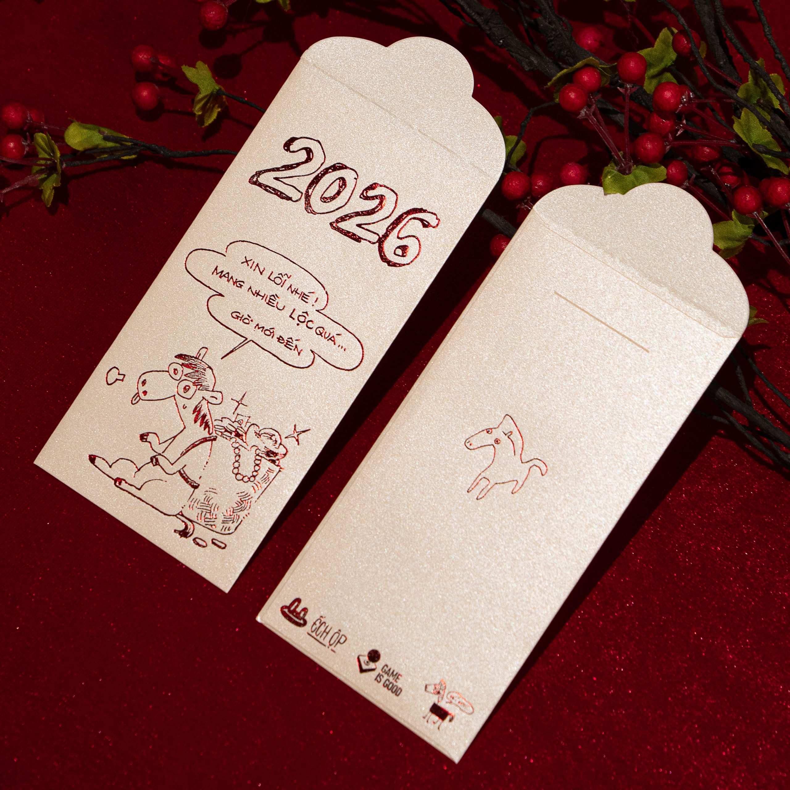 Bộ lì xì “Hí Hí” là dự án hợp tác giữa thương hiệu Game Is Good (GIG) và họa sĩ Ếch Ộp, ra mắt nhân dịp Tết Bính Ngọ 2026. Lấy cảm hứng từ năm con Ngựa, bộ sưu tập gồm ba mẫu thiết kế độc đáo mang tên “B Lè”, “Hứng Khởi” và “Ship Lộc”, kết hợp tinh tế giữa phong cách vui nhộn của Ếch Ộp và sự trẻ trung của GIG. Mỗi bao lì xì được in ép kim vàng nổi bật trên nền giấy ánh nhũ đỏ rực – biểu tượng của sự may mắn và thịnh vượng ngày xuân. Sản phẩm này không chỉ là món quà Tết cao cấp, mà còn truyền tải thông điệp yêu thương và niềm vui cho năm mới.